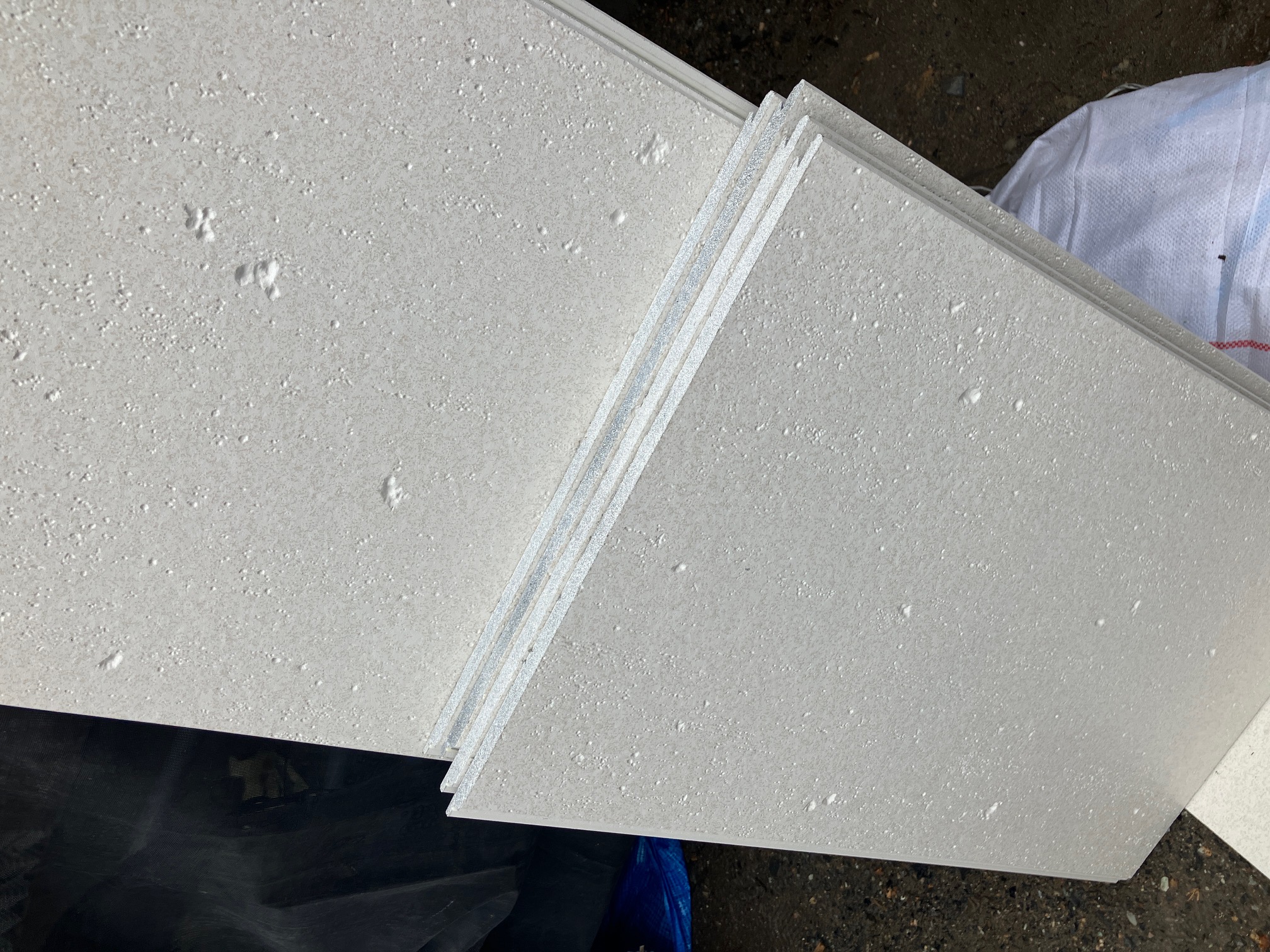 大量のサイディングボードが丁寧に養生・保管されています。