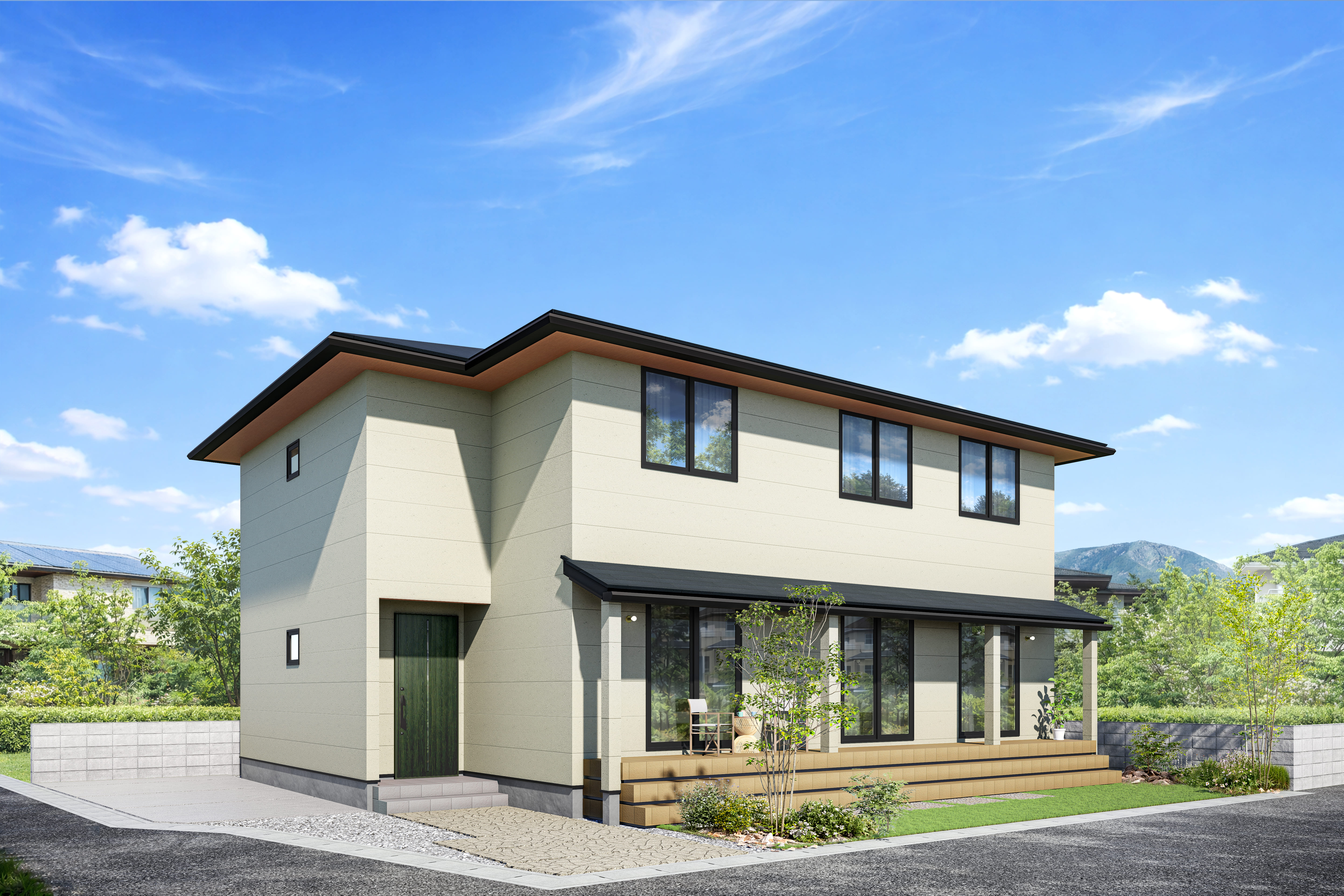 深い軒を持つモダンなデザインが特徴で、開放的なウッドデッキが目を引きます。
